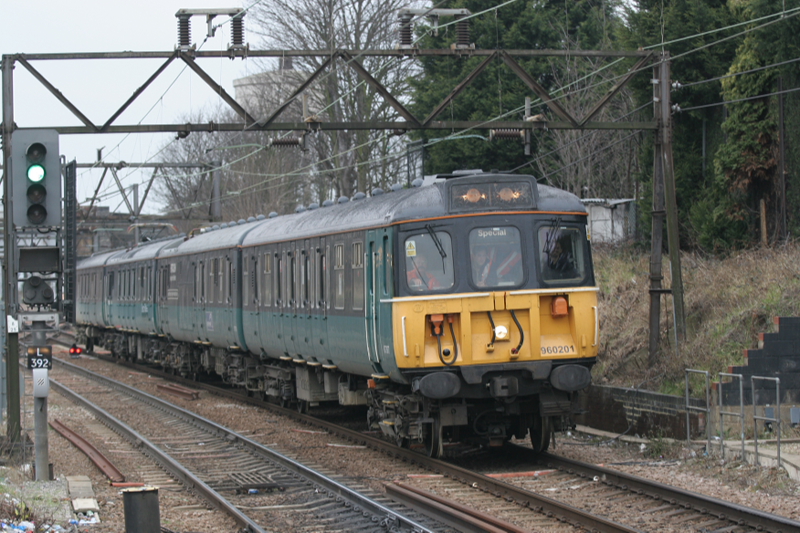 In 2002, the promise of potential rolling stock orders in UK lead the Japanese manufacturer Hitachi to investigate the possibility of entering the market. Recent experience of others in respect of excessive time taken in acquiring a Safety Case to allow the trains to enter service in the UK suggested to Hitachi that it would be worthwhile investing money in a test train to evaluate their traction in the UK environment. This would avoid expensive delays in the future. This resulted in a contract being let to AEA Technology Rail at Derby to convert a Class 310 EMU into a test train capable of running on both AC and DC supplies. An original 25kV power car was fitted with the Hitachi traction package, including transformer and traction motors. The train could operate on either 25kV AC via the original pantograph on the converted power car or from 3rd rail 650 v DC fed to the power car via cables through the train from shoe gear fitted underneath the cabs of the 310 unit. The tests needed to be carried out initially at specific sites which were to be electrically isolated from the rest of the railway and therefore the train needed conventional traction in order to transit from the depot to the test site prior to switching in the Hitachi traction. To this end the AC version of the train was made up of an original 310 AC power car, two driving trailers and the converted Hitachi power car. In addition for DC operation a class 423 DC power car was acquired which replaced the 310 power car. The train was known as the 'Verification Train' or V-Train was numbered 960201 and the author was involved with the on-track testing of the train during which time it undertook test running on both DC and AC lines as well as on the CTRL itself. The fact that Hitachi eventually won the order for the domestic CTRL services appears to have justified the decision to verify that the traction did not interfere with the infrastructure. |